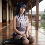 Pose: She is sitting with her knees bent upward and both hands resting together in front of them, slightly turned to the right, giving an impression of a polite, calm, and slightly shy demeanor. She smiles gently, with her shoulders slightly hunched, adding an introspective touch. This posture perfectly matches Hinata’s personality — shy and serene.