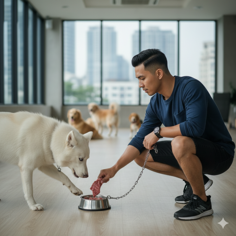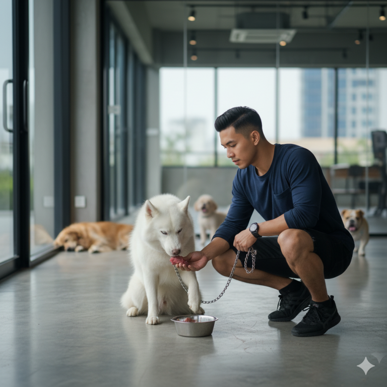He is squatting, facing a large, snow-white Siberian Husky with sharp eyes. The dog’s paw is reaching toward its meal, teeth slightly exposed, while the man feeds it a slice of red meat with his right hand and holds a chain in his left.