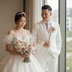 Outfit (Woman): Dress: A wedding gown in ivory white or pure white with a ball gown silhouette (flared skirt). The upper part of the gown is off-shoulder with sheer illusion material (thin/net fabric) on the shoulders and chest, decorated with crystals or small beads. The sleeves are short and puffed with ruffle details made of organza or tulle. The skirt is adorned with lace or floral applique details. Accessories: A small sparkling crown or tiara on top of her head. A thin silver chain necklace with a pearl or small diamond pendant around her neck. Small earrings. Details: A large flower bouquet with soft pastel colors (light pink, light purple, cream, and a bit of green), tied with a long white ribbon.