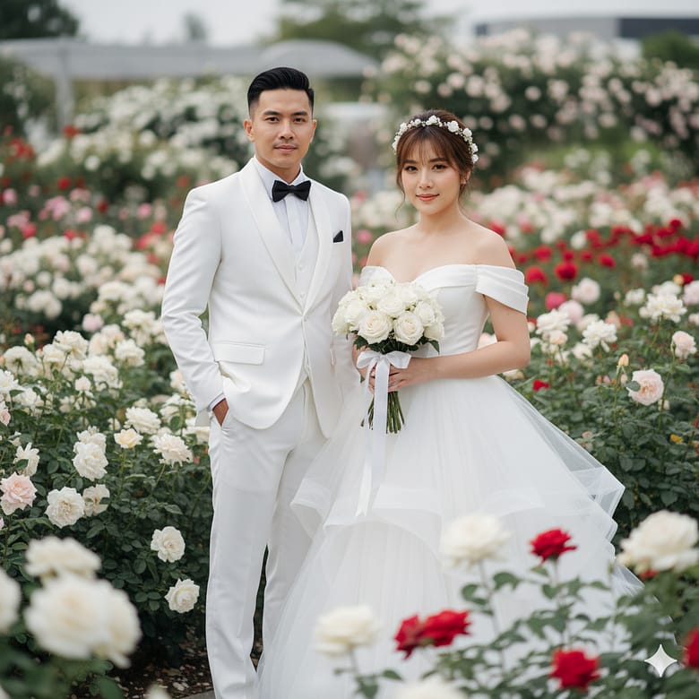 Outfit (Woman): Dress: Long white wedding gown with a ball gown or A-line silhouette. The top of the gown is off-shoulder with a sweetheart neckline, featuring ruffle details made of tulle or organza around the shoulders and chest. The skirt of the gown has multiple layers of tulle or chiffon to create volume. Accessories: Small black ribbon on the side of the hair. Small and simple earrings. Shoes: Clean white pointed-toe pumps or heels.