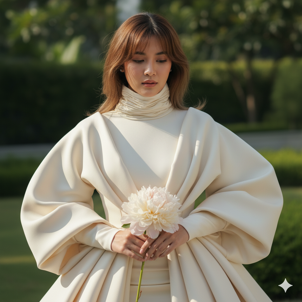 Lighting is crisp and directional, highlighting the rich fabric details. The overall tone presents a modern luxury aesthetic with clean color grading, rendered in 8K ultra-realistic resolution. Focus sharply on the garment’s texture and the graceful positioning of her hands. She holds a large peony in her hands, her eyes gently looking downward.