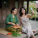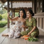 Next to her is another woman — myself (using the uploaded face) — taking a selfie. She has a slim figure, wearing a white batik cloth with brown patterns wrapped around her chest, covering from the chest down to the thighs. Her hair is long, black, and styled in a messy bob.