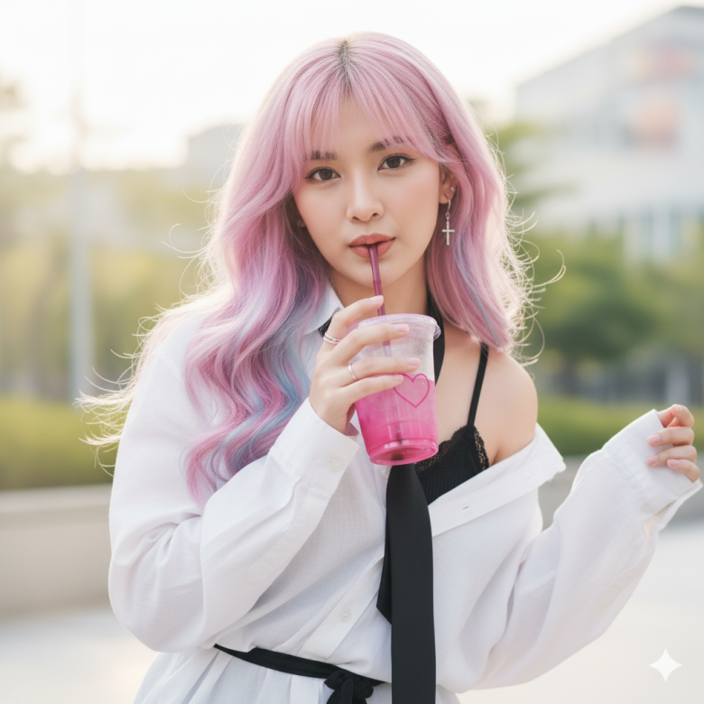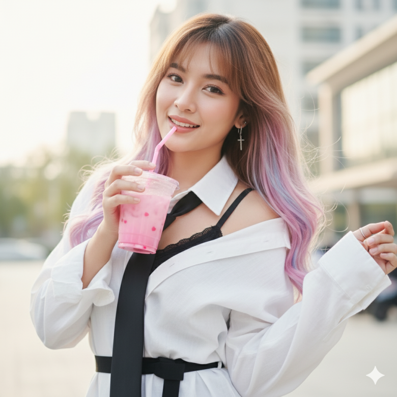 Lighting: Setup: Soft natural light from the front-top direction, simulating bright but indirect morning or afternoon sunlight. Quality: Soft light, producing gentle shadows and smooth skin tone gradients. Direction: Main light from approximately the 10 or 11 o’clock direction (front-top-left) to add subtle dimension to the face and hair. Fill light from the opposite side to lift shadows. Color: Warm and airy, with faint reflections of pink and pastel purple from the hair and drink, creating a soft overall hue.