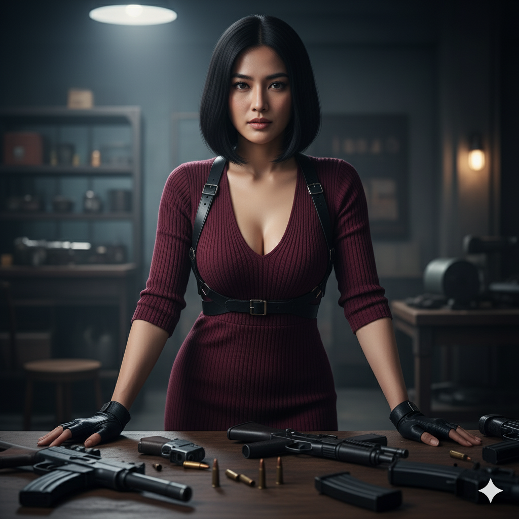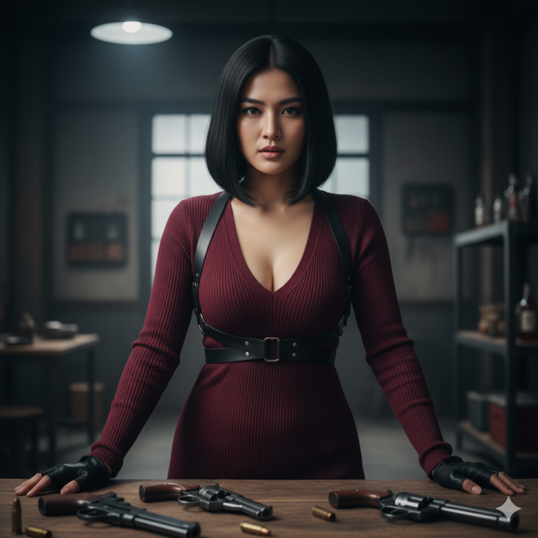 She wears a deep burgundy ribbed low v-neck dress that subtly contours her form, paired with a structured black leather harness that gleams faintly under moody light. Black gloves envelop her hands with quiet confidence as she rests them on a wooden table scattered with various firearms — a silent testament to her readiness.