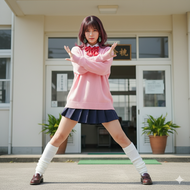 The woman is striking a dynamic, assertive pose, with her legs spread wide and her arms crossed over her chest, palms open and facing forward, matching the pose in the provided reference image. The background is the main entrance door of a Japanese high school building, with light cream or pale grey walls, large windows with white frames, and a school name plaque above the door. There are subtle details of green potted plants on the sides of the door. The lighting is bright natural light, like on a clear morning, captured at a perspective that suggests a model height of 160cm.