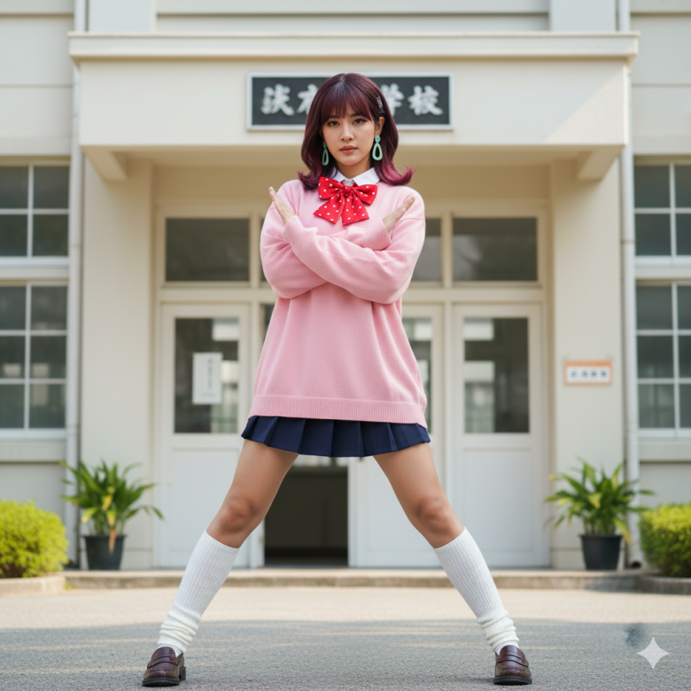 Ultra-realistic cosplay of a me with a medium-length dark brown bob hairstyle with subtle burgundy highlights, soft face-framing layers, and thin, side-swept bangs. She is wearing an oversized, soft baby pink knitted crew neck sweater with the bottom edge pulled out, and a large, bright red satin bow tie with small white polka dots at the collar. She has a high-waisted, dark navy blue pleated mini skirt that is very short, almost aligned with the pulled-out knitted crew neck sweater., ending mid-thigh. She is wearing crisp white leg warmers and shiny dark brown leather loafers. She has dangling transparent mint green or light blue teardrop earrings.
