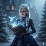 Lighting: Setup: A mix of ambient night light and magical illumination. Quality: Soft, diffused, glowing, with clear highlights from the magical elements. Direction: – Main Light (Magical Source): The glowing ice crystal in the book acts as the key light, casting an icy-blue fill on the model’s lower face, hands, and front of the gown. – Secondary Light (Ambient/Moonlight): Gentle, cool light from the upper front-right (moon or stars), softly illuminating the top of the head, shoulders, and left side of the body. – Backlight/Rim Light: A faint cool backlight from the distant castle and sparkling snow adds a subtle halo around the hair and shoulders, separating her from the dark background. Color: Dominated by cold tones — icy blue, silver, and white.