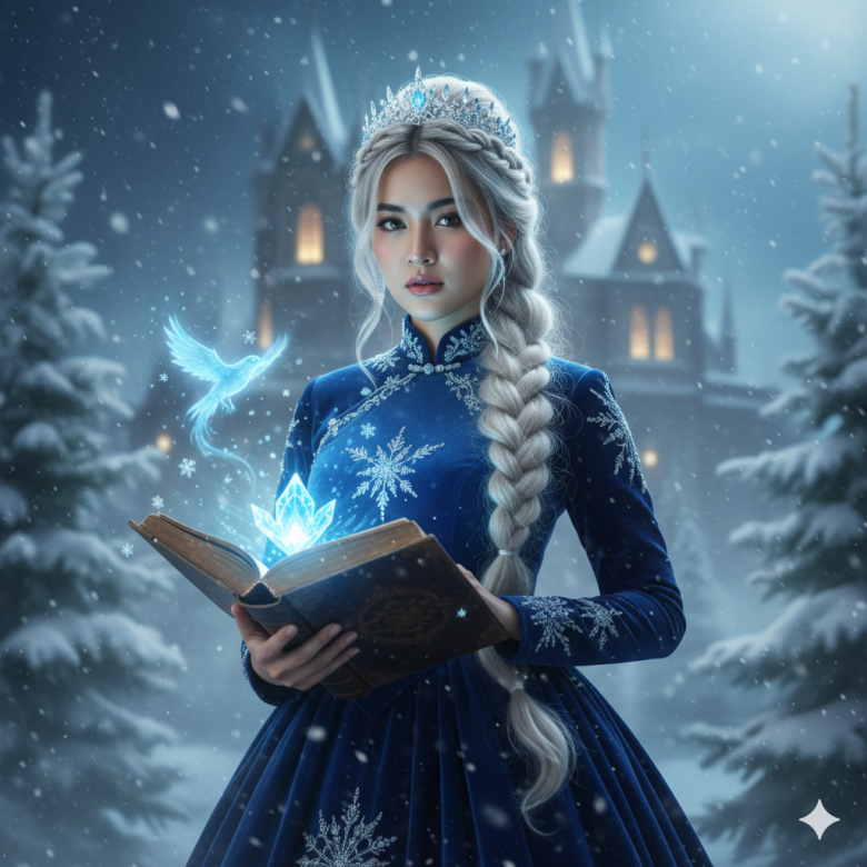 Lighting: Setup: A mix of ambient night light and magical illumination. Quality: Soft, diffused, glowing, with clear highlights from the magical elements. Direction: – Main Light (Magical Source): The glowing ice crystal in the book acts as the key light, casting an icy-blue fill on the model’s lower face, hands, and front of the gown. – Secondary Light (Ambient/Moonlight): Gentle, cool light from the upper front-right (moon or stars), softly illuminating the top of the head, shoulders, and left side of the body. – Backlight/Rim Light: A faint cool backlight from the distant castle and sparkling snow adds a subtle halo around the hair and shoulders, separating her from the dark background. Color: Dominated by cold tones — icy blue, silver, and white.