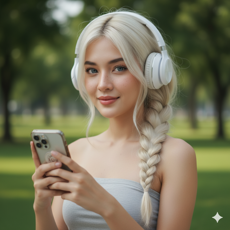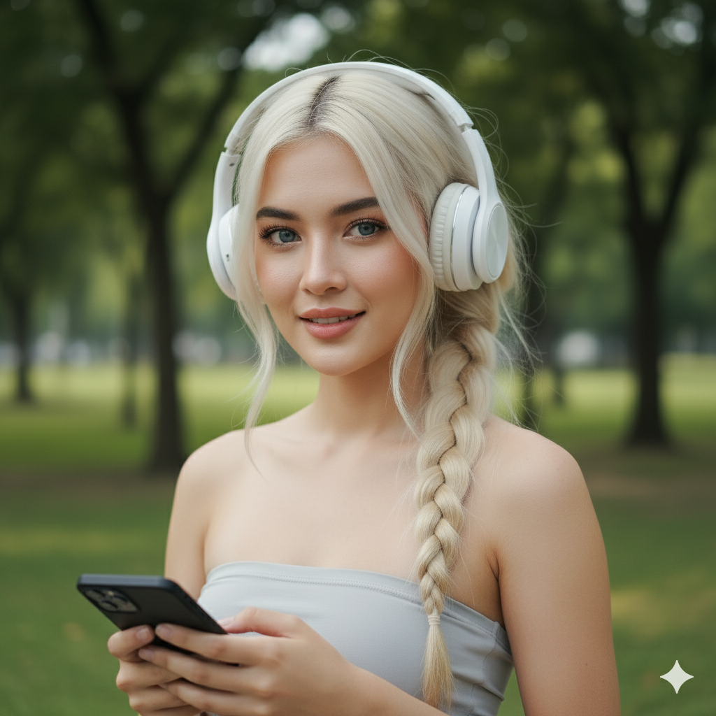 Ultra realistic portrait of me in a park, soft natural daylight, platinum blonde hair in a long braid over shoulder, white over-ear headphones, holding a smartphone with both hands, light grey strapless top. fair skin with subtle freckles, blue eyes, delicate makeup, friendly expression. lush green park background with soft depth of field blur, cinematic tone, realistic skin detail, 8k render, DSLR depth of field, candid composition, photoreal lighting, peaceful mood, high clarity and color balance.