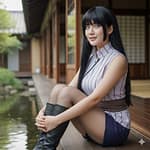 Pose: She is sitting with her knees bent upward and both hands resting together in front of them, slightly turned to the right, giving an impression of a polite, calm, and slightly shy demeanor. She smiles gently, with her shoulders slightly hunched, adding an introspective touch. This posture perfectly matches Hinata’s personality — shy and serene.