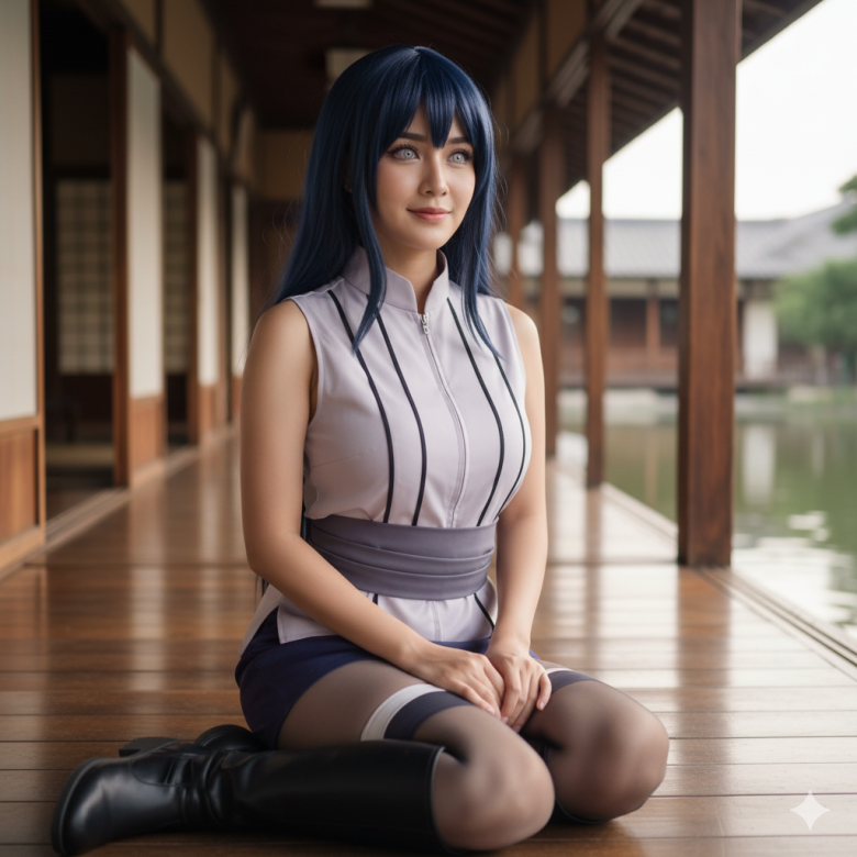 Edit my photo wearing a cosplay of the character Hinata Hyuga from the Naruto series. The outfit and hairstyle are highly identical to Hinata’s appearance, especially the version from Naruto The Last.