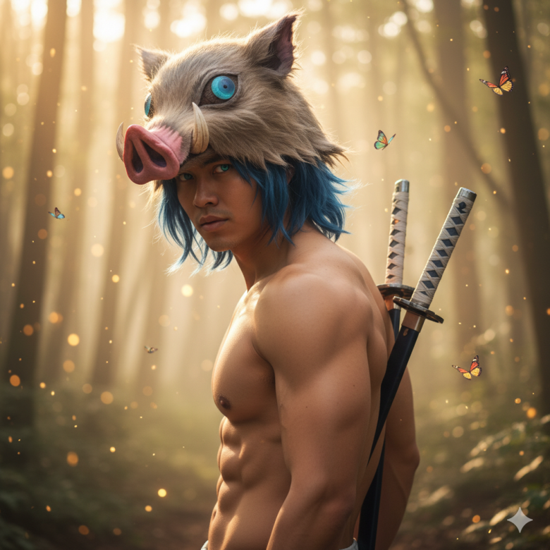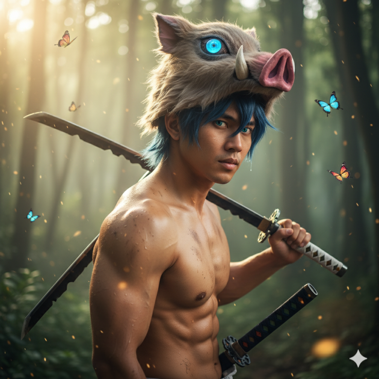He gives an intense over-the-shoulder gaze with his emerald blue eye,with medium blue hair.with inosuke two katana swords.He stands in a lush, misty, sun-drenched forest with dramatic golden-hour sunlight casting strong highlights and shadows across his back. Shallow depth of field (bokeh), cinematic lighting, ethereal golden dust motes and colorful butterflies floating in the air, 8k, ultra-detailed textures.use the uploaded image and don’t change the face.