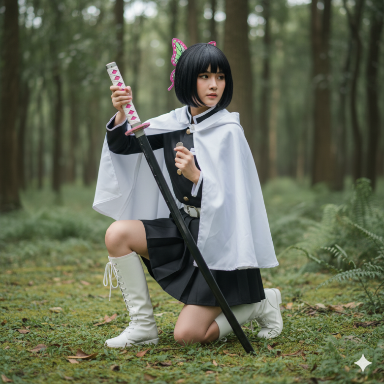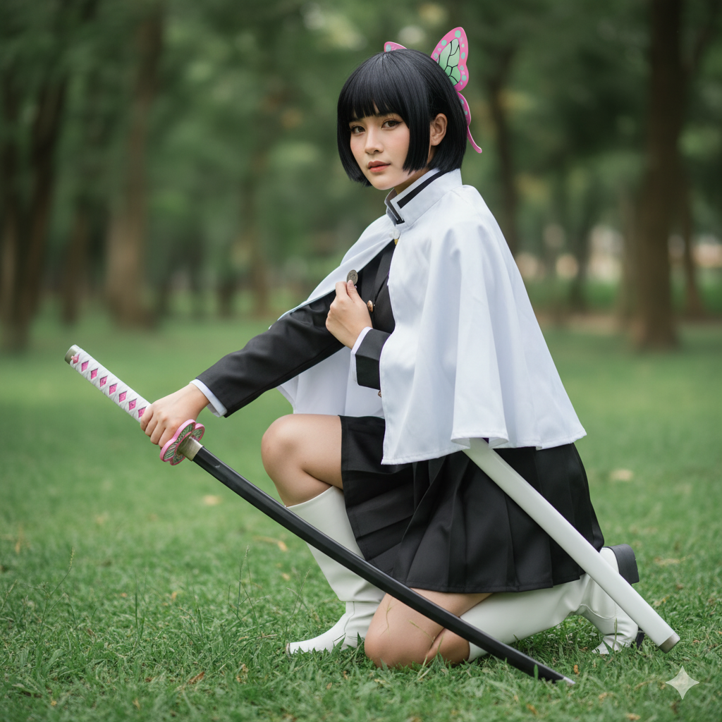 Create an ultra photorealistic image, full shot of a young woman cosplaying Kanao Tsuyuri from Demon Slayer, with an extremely accurate and detailed depiction of the character. She is kneeling with her right knee on the grass in a natural forest setting, and her left knee is bent with her left foot resting on the surface. The photo is taken from the side with three-quarters of her body visible. Her upper body leans slightly forward.
