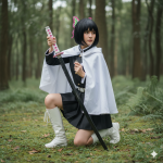 She is wearing the standard Demon Slayer Corps uniform, including a black pleated skirt, a white short cape, and white knee-high boots. Her expression is determined and serious. The lighting is soft and natural, suggesting an overcast day, with fine details visible in the fabric of her uniform, the texture of the wood, and the surrounding foliage. The background is a slightly blurred forest, enhancing the focus on the subject. Integrate the facial features of the provided user photo onto this character, ensuring the described hairstyle is maintained and not influenced by the uploaded photo’s original hair.