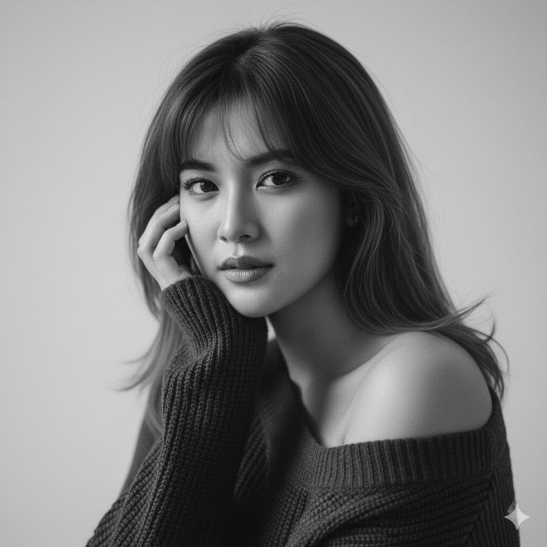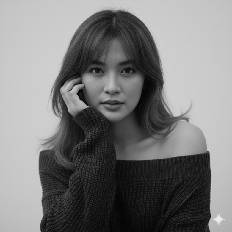 Using the attached image as a subject, create a striking black and white close-up portrait. The subject gazes intensely at the camera, with shoulder-length wavy hair and bangs framing a serious expression. They wear a cozy, off-the-shoulder dark knit sweater, with one hand gently pressed against their cheek. Dramatic lighting emphasizes dark, expressive eyes and full lips against a simple, light background.