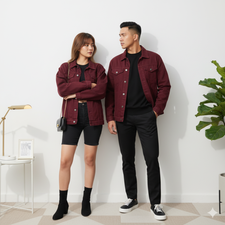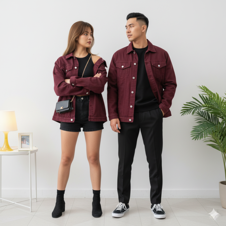 Outfit (Man): Top: A long-sleeve T-shirt or thin sweater in plain black with a standard round neckline. Bottom: Black trousers with a straight or slightly loose fit, neatly pressed at the front. Outerwear: An oversized maroon (deep burgundy) denim jacket matching the woman’s, with button details and chest pockets. The jacket is unbuttoned. Shoes: Low-top sneakers in black (Converse/Vans style) with thick white soles and white laces.