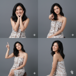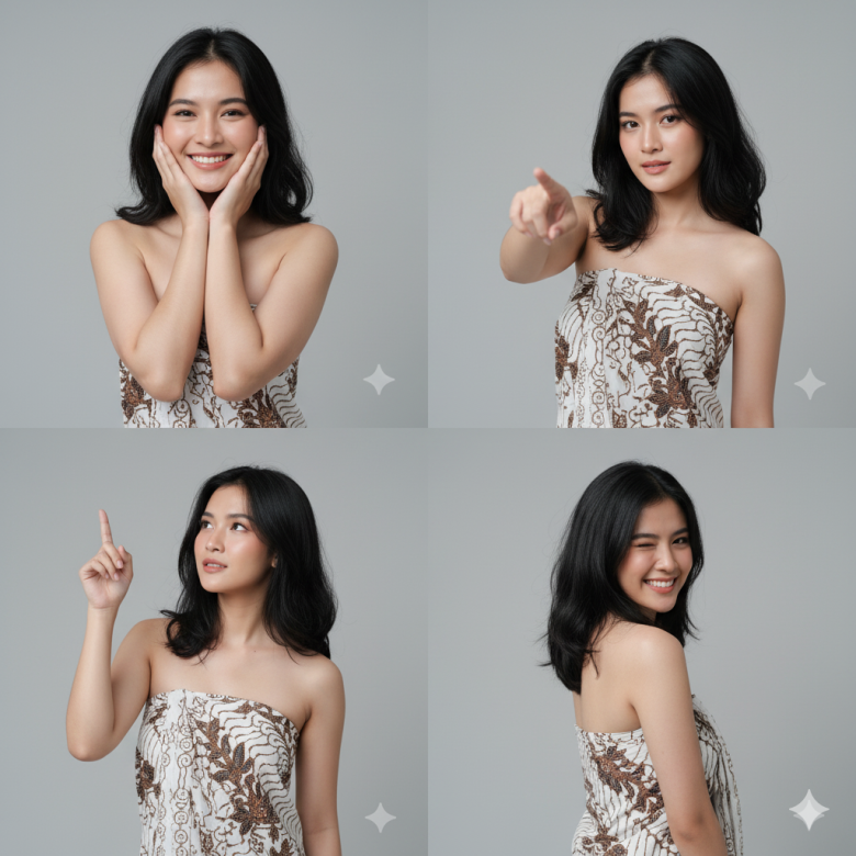 📸 Bottom left photo: Pose: One hand raised with the index finger pointing upward, eyes looking up. Expression: Thoughtful or as if having an idea. Additional prompt: Looking upward with one finger pointing up, thoughtful expression.