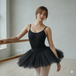 Bottom (Tutu/Skirt): A short, layered black tutu made of tulle or fine mesh that flares softly. The skirt covers the hips and part of the upper thighs. The bottom part of the leotard or attached shorts in semi-transparent black is visible underneath. No separate underwear visible.