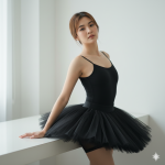 Outfit (Leotard with Skirt): Wearing a black ballet costume.
