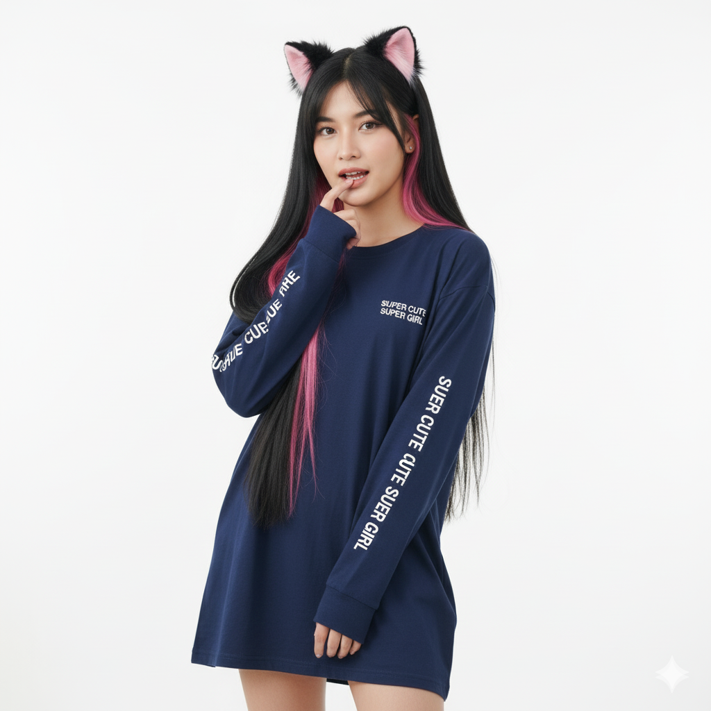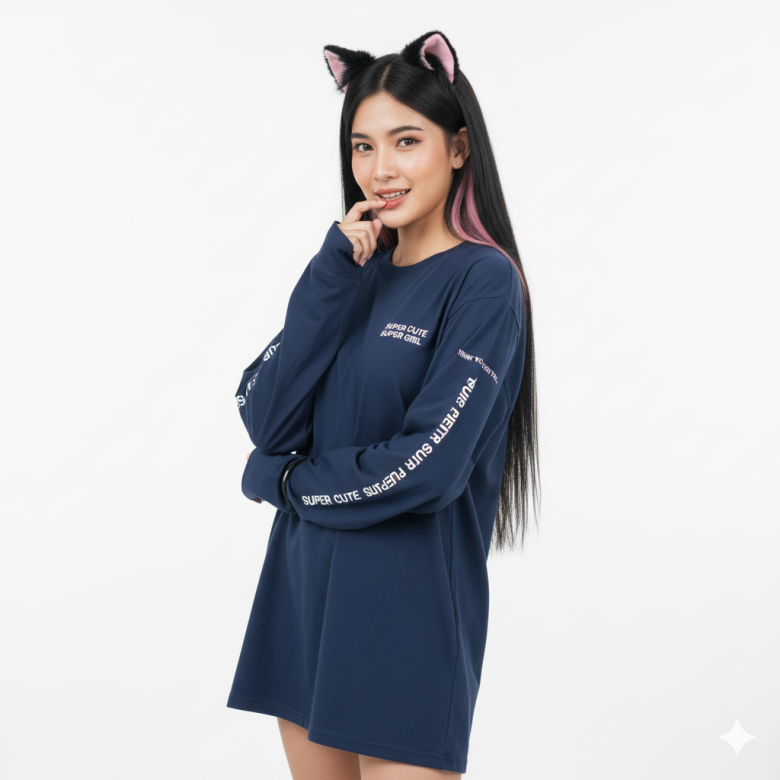 Outfit (Top/Bottom/Dress/Zip): The model is wearing an oversized, long-sleeved t-shirt or a loose-fitting navy blue minidress. The sleeves are long, partially covering her palms.