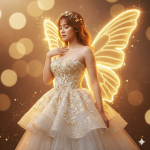 The composition feels balanced despite asymmetrical pose — the radiance of wings counteracts the gown’s volume.Color Palette: