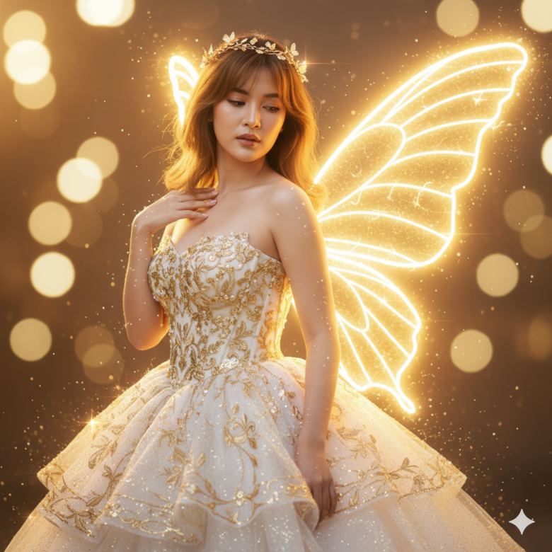 Focus: Razor-sharp on the face and embroidered bodice, with soft-focus background and luminous wing effects.