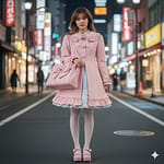 “style”: “ultra realistic, HDR lighting, cinematic night photography, pastel tones, Harajuku Lolita fashion, Japanese street aesthetic, detailed fabric and skin texture, 8k resolution, full-body framing, shallow depth of field, soft bokeh background”,