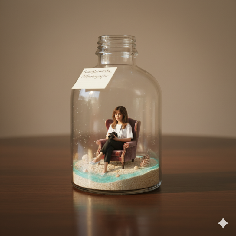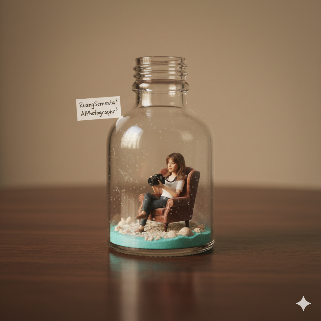 Create a hyper-real miniature diorama inside a clear glass bottle on a wooden table. Place (preserves my photo upload) seated in a plush armchair, relaxed posture, holding DSLR Camera in their hands with natural grip and finger tension—no book or extra props.