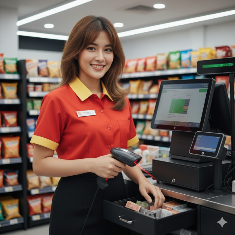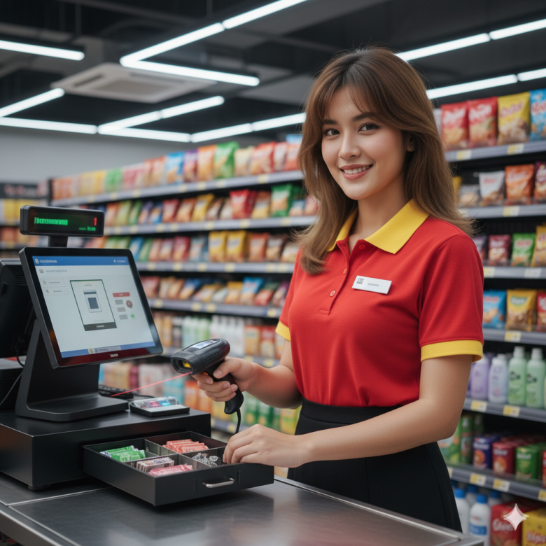Ultra-realistic 9:16 minimarket cashier photo. *IDENTITY LOCK: replicate exact face & body from [IMAGE A] (no change to face/head/skin tone). **Show face to camera* with warm smile and clear eye contact. Subject: young female clerk in red shirt with yellow collar/cuffs + name tag, black skirt. Action: holding barcode scanner with red beam at checkout; POS monitor, customer display, cash drawer visible; snack shelves behind slightly bokeh. Lighting: bright white LED store lights, neutral color, clean skin texture; mild rim from fixtures; crisp fabric details. Framing: waist-up 3/4 angle at counter. Style: photoreal retail. *Negative*: wrong face, mask/obstruction, CGI/anime look, motion blur, heavy retouch, wrong uniform colors, cluttered background