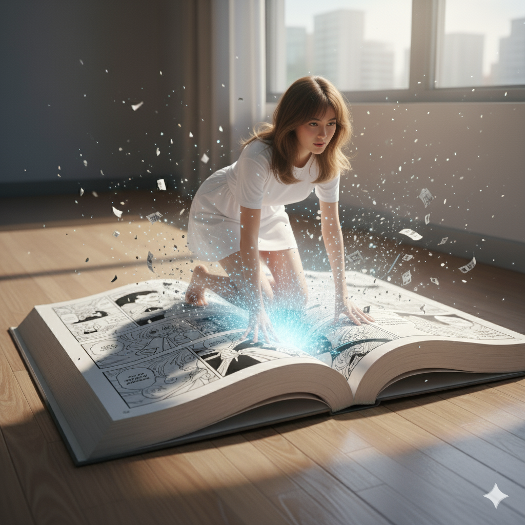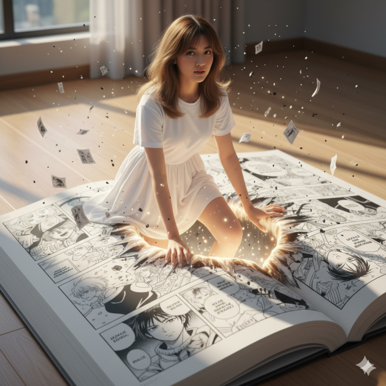 A hyper-realistic cinematic photo of a beautiful young woman with the same face as in the uploaded image, slowly climbing out of a large manga book lying flat on the floor.