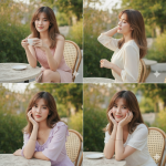 4. Playful pose, both hands near the face, soft smile while slightly tilting her head — cheerful and graceful vibe.