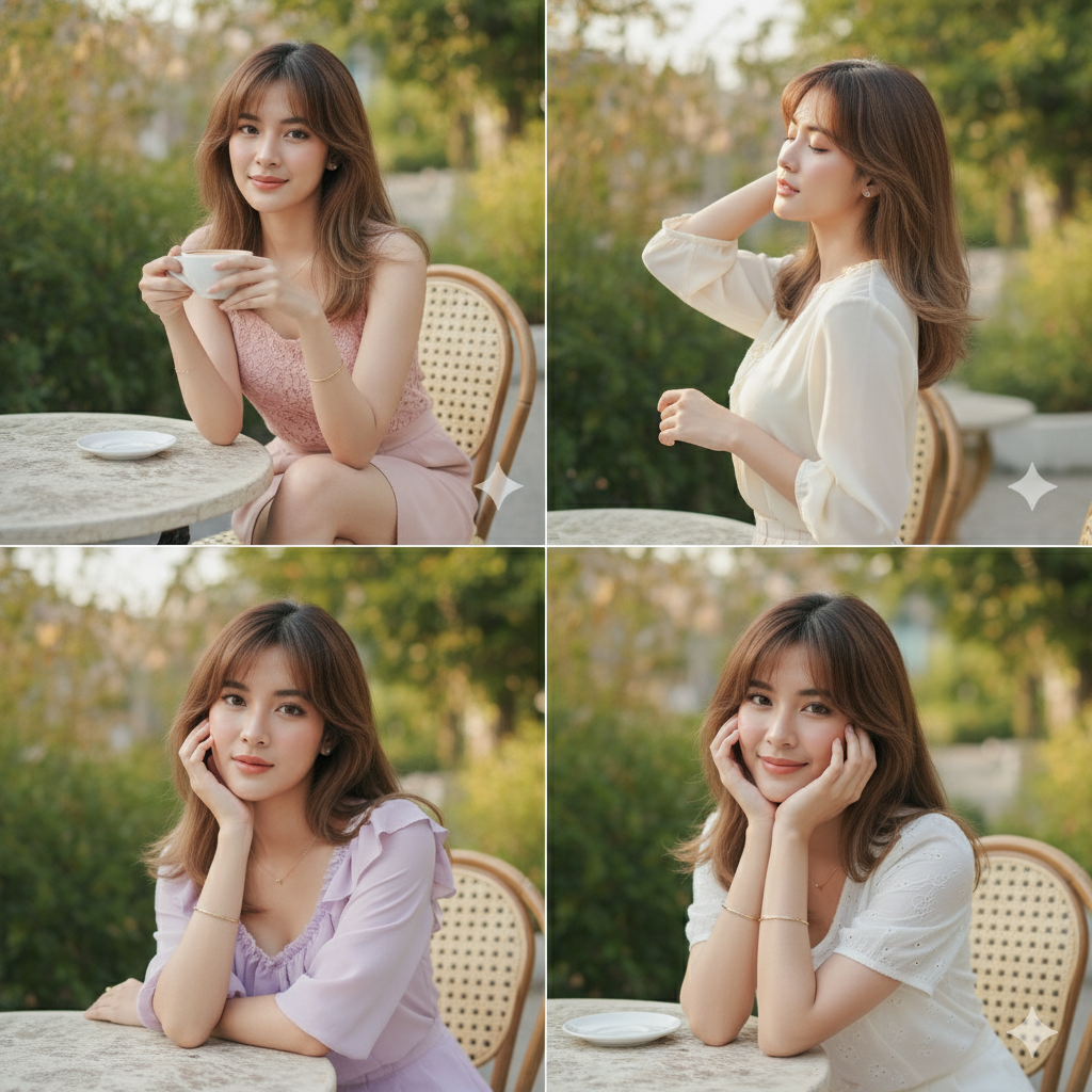 All 4 shots are close-up to half-body, taken outdoors in a softly lit romantic café or garden setting, with consistent warm daylight (golden hour or soft morning light). The mood is delicate, dreamy, and feminine, captured naturally with a DSLR camera in 9:16 vertical orientation.
