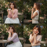 A soft feminine ensemble — she wears a pastel-toned top (like blush pink, cream, or lavender) with delicate textures such as lace, chiffon, or ruffles. Paired with high-waisted flowy skirt or light trousers in matching pastel or white tone. Outfit changes subtly in fabric or cut between each photo (but stays within the same soft feminine aesthetic).