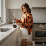 Close-up of realistic photography of a stunningly beautiful Indonesian woman, busty, having just woken up, gracefully making coffee in a sleek, modern, and impeccably clean kitchen. The woman wears an oversized orange and black horizontal striped top, loosely cut and reaching below the hips. Her white shorts are straight and slightly loose, paired with white sneakers.