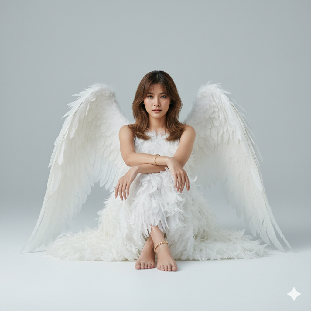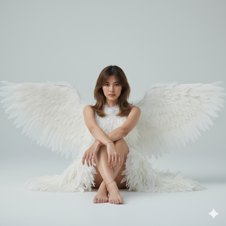 The background is simple and plain, with light gray tones that make the figure and bright wings stand out prominently. There are no objects or distractions pulling attention away from the subject. The lighting is soft and even, emphasizing the textures of both feathers and skin.