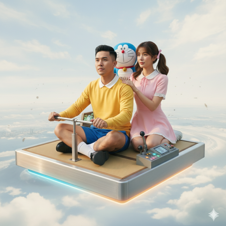 The overall aesthetic is clean, sweet, and elegant, reflecting her gentle and kind personality. The background is soft and minimalist, perhaps a light pastel color to keep the focus on her. Doraemon sits close behind her, looking over her shoulder with curiosity. A faint blue-amber glow shines from beneath the platform, forming a soft energy field that keeps it hovering. Around them, gentle ripples of light and warped air suggest they’re about to enter a time gateway. The background mixes clouds and distant landscape with subtle surreal distortions, creating a cinematic, realistic atmosphere.