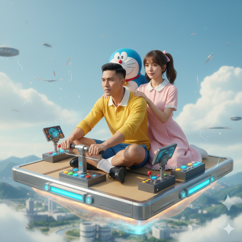 Sitting on a floating square-shaped time machine platform with a tatami-textured base and metallic frame. The man (using the uploaded face) sits in the center, slightly leaning forward as she operates the front steering handle and side control panels filled with glowing buttons, levers, and small digital screens. He holding steers and wears his iconic yellow long-sleeved T-shirt, blue shorts, short white socks, and black shoes from Doraemon, which are simple in design with a small white collar and subtle lace accents. His black hair is short, straight, and looks neat.