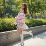 “prompt”: “Ultra realistic full-body portrait of a young woman posing playfully outdoors on a sunny day. The face will follow the uploaded reference image. She stands near a low brick wall with lush green trees behind her, lifting one leg slightly backward while resting one arm on the wall. Her expression is cheerful and confident, looking slightly sideways toward the camera. Her hair flows naturally over her shoulders and down her back. Her hairstyle moves gently with the breeze, catching the sunlight for a glossy natural shine. She wears a short floral dress with pink, white, and green patterns, layered with a light pink jacket draped loosely over her shoulders. A small pastel pink shoulder bag hangs elegantly by her side, and she completes the outfit with sleek white knee-high boots. The environment combines urban and natural elements — a stone wall, tiled ground, and green trees. Lighting is bright natural daylight with soft warm highlights and gentle shadows, creating a vibrant and realistic tone. The atmosphere feels feminine, modern, and fresh, blending Korean street fashion with cinematic elegance.”,