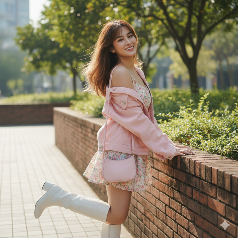 “prompt”: “Ultra realistic full-body portrait of a young woman posing playfully outdoors on a sunny day. The face will follow the uploaded reference image. She stands near a low brick wall with lush green trees behind her, lifting one leg slightly backward while resting one arm on the wall. Her expression is cheerful and confident, looking slightly sideways toward the camera. Her hair flows naturally over her shoulders and down her back. Her hairstyle moves gently with the breeze, catching the sunlight for a glossy natural shine. She wears a short floral dress with pink, white, and green patterns, layered with a light pink jacket draped loosely over her shoulders. A small pastel pink shoulder bag hangs elegantly by her side, and she completes the outfit with sleek white knee-high boots. The environment combines urban and natural elements — a stone wall, tiled ground, and green trees. Lighting is bright natural daylight with soft warm highlights and gentle shadows, creating a vibrant and realistic tone. The atmosphere feels feminine, modern, and fresh, blending Korean street fashion with cinematic elegance.”,