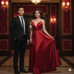 Composition: Rules: Rule of thirds — subjects are placed in the center, leaning slightly left, with negative space on the right. Negative Space: Ample on the right and upper area, giving a sense of spaciousness and elegance to the scene. Balance: Harmonious, with both subjects forming a strong, visually captivating composition. Color Palette: Strong contrast between red (wall, gown) and black (man’s suit), accented with white (shirt) and gold (accessories, lighting). Texture Detail: Clearly visible in the satin sheen of the gown, the smooth texture of the suit, and the sparkle of the earrings. Wind Direction: Very light artificial breeze from the front or left side (from the viewer’s perspective) gently moves a few strands of the woman’s hair, adding a dynamic touch.