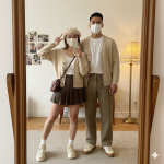 Composition: Rules: The subjects fill the center of the mirror. The floor lamp on the right and the photo collage on the left provide visual balance around them. Negative Space: The white wall around the subjects and the reflection of the carpeted floor serve as warm negative space. Balance: Balanced composition — the man and woman form a harmonious pair within the mirror frame. Color Palette: Neutral monochrome (Beige, Brown, White) with warm Golden Yellow accents. Texture Detail: Clearly visible on the knit cardigan, pleated skirt folds, and the loose fabric of the man’s trousers. Wind Direction: None indicated.