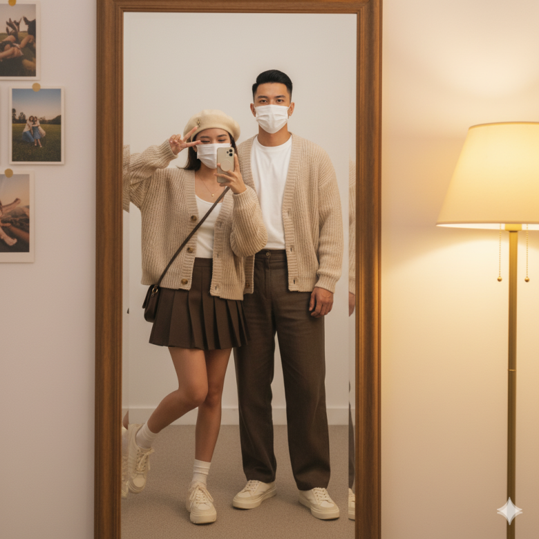 Composition: Rules: The subjects fill the center of the mirror. The floor lamp on the right and the photo collage on the left provide visual balance around them. Negative Space: The white wall around the subjects and the reflection of the carpeted floor serve as warm negative space. Balance: Balanced composition — the man and woman form a harmonious pair within the mirror frame. Color Palette: Neutral monochrome (Beige, Brown, White) with warm Golden Yellow accents. Texture Detail: Clearly visible on the knit cardigan, pleated skirt folds, and the loose fabric of the man’s trousers. Wind Direction: None indicated.