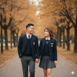 Outfit (Man – School Uniform): Top: Clean white formal shirt with a standard collar, tucked into the pants. A navy blue V-neck sweater vest worn over the shirt. Outer: Navy blue school blazer with a badge on the left chest. Bottom: Long wool or chino trousers in dark gray or charcoal gray, with a straight and neat cut. Accessories: Thin plain black formal tie, neatly knotted. Black or navy blue backpack on the back. Shoes: Black loafers or formal shoes.