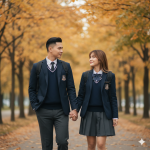 Composition: Rules: The subjects fill the center of the frame. Vertical lines of the trees in the background serve as framing elements. Negative Space: Blurred (bokeh) autumn leaves in the background act as colorful, textured negative space that emphasizes the subjects. Balance: Balanced, with the hand-holding couple as the center of composition. Color Palette: Autumn Contrast (Warm) vs. Uniform (Cool) – Navy Blue, Gray, White, with Golden Yellow and Orange background. Texture Detail: Clearly visible in the smooth fabric of the blazers, the knit of the sweater vests, and the dry leaves’ texture. Wind Direction: No indication of wind; hair and clothes remain still.