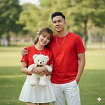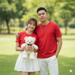 Composition: Rules: Subjects fill the center of the frame, creating a strong and vertical composition. Negative Space: Green grass and blurred trees (bokeh) in the background serve as soft, fresh negative space that highlights the subjects. Balance: Balanced, with the close couple filling the center of the frame. Color Palette: Bright Red–White contrast with Green background. Texture Detail: Clearly visible in the soft T-shirt fabric, skirt pleats, teddy bear fur, and chain necklace. Wind Direction: No indication of wind; hair and clothing remain still.