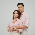 Outfit (Man): Top: Long-sleeved cotton shirt in soft pink or baby pink matching the woman’s, with front buttons and a slightly open collar. Sleeves neatly rolled up. Bottom: Long pants in light beige or off-white (only partially visible). Accessories: No visible accessories.