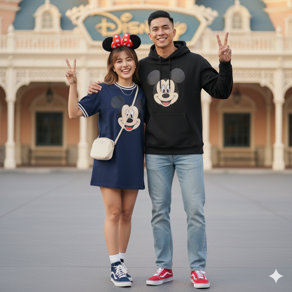 Composition: Rules: Symmetry and balance — both subjects fill the central portion of the frame proportionally. Negative Space: Minimal; the subjects occupy most of the vertical frame. The dark background with golden light highlights acts as negative space that emphasizes the subjects. Balance: Perfectly balanced, the pair forms a cohesive, visually strong composition. Color Palette: Cheerful primary colors (Red, Blue, Black, White) — perfectly aligned with the Disney theme. Texture Detail: Clearly visible in the knit fabric of the hoodie, the denim jeans, and the canvas texture of the sneakers. Wind Direction: No noticeable wind; hair and clothing appear still.