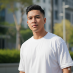 Outfit (Man): Top: Plain white short-sleeve T-shirt with a standard round neckline and large printed text. Bottom: Plain light blue (baby blue) shorts made of lightweight cotton or parachute fabric, ending above the knee. Accessories: None visible. Shoes: White low-top sneakers with thick soles. Details: Plain white ankle socks.