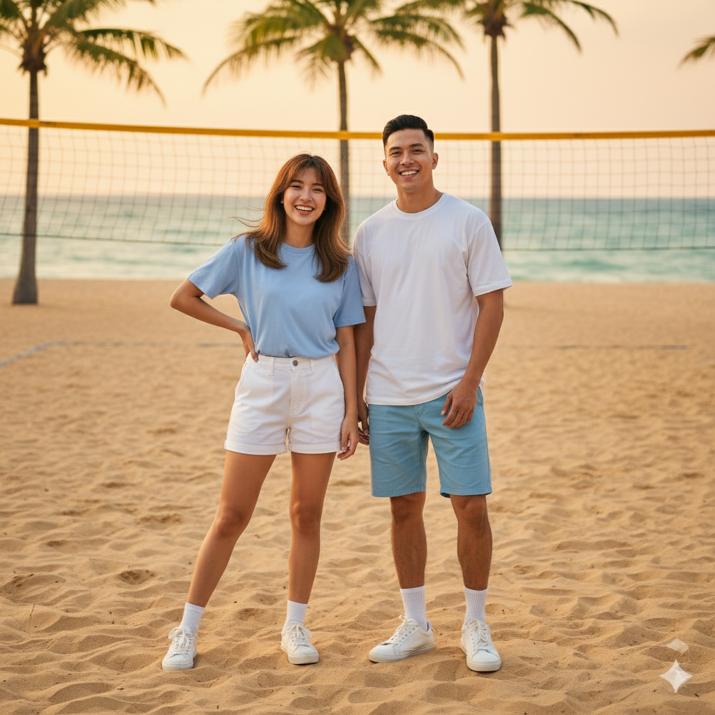 Composition: Rules: Symmetry and balance. The subjects are positioned in the center of the frame. The volleyball net in the mid-ground acts as a horizontal line dividing the frame and serving as a visual anchor. Negative Space: Significant space at the top (sky) and sides (beach/sea), evoking a sense of openness and freedom. Balance: Balanced composition, with both subjects occupying the central area proportionally. Color Palette: A harmonious mix of pastel tones (Light Blue, White) with warm Golden Hour hues (Orange, Gold). Texture Detail: Clearly visible on the T-shirt fabric, the shorts’ surface, and the sand grains underfoot. Wind Direction: A gentle sea breeze blows softly from behind, causing a few strands of the woman’s long hair to move slightly, adding a dynamic touch.