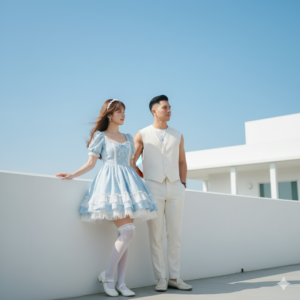 Composition: Rules: Architectural lines (balcony railings, walls) act as leading lines directing the viewer’s gaze toward the subjects. The subjects are positioned across the left and center thirds of the frame. Negative Space: Dominant in the upper area (vast blue sky) and the right side (plain white wall), creating openness and focus on the subjects. Balance: Balanced composition, with the subjects occupying the left and center, and the white architecture filling the right. Color Palette: Dominated by Light Blue and White, forming a cool and refreshing tone. Texture Detail: Clearly visible in the lace of the dress, the fabric of the man’s vest, and the balcony railing details. Wind Direction: A gentle breeze causes a few strands of the woman’s long hair to move softly, adding a natural, delicate motion.
